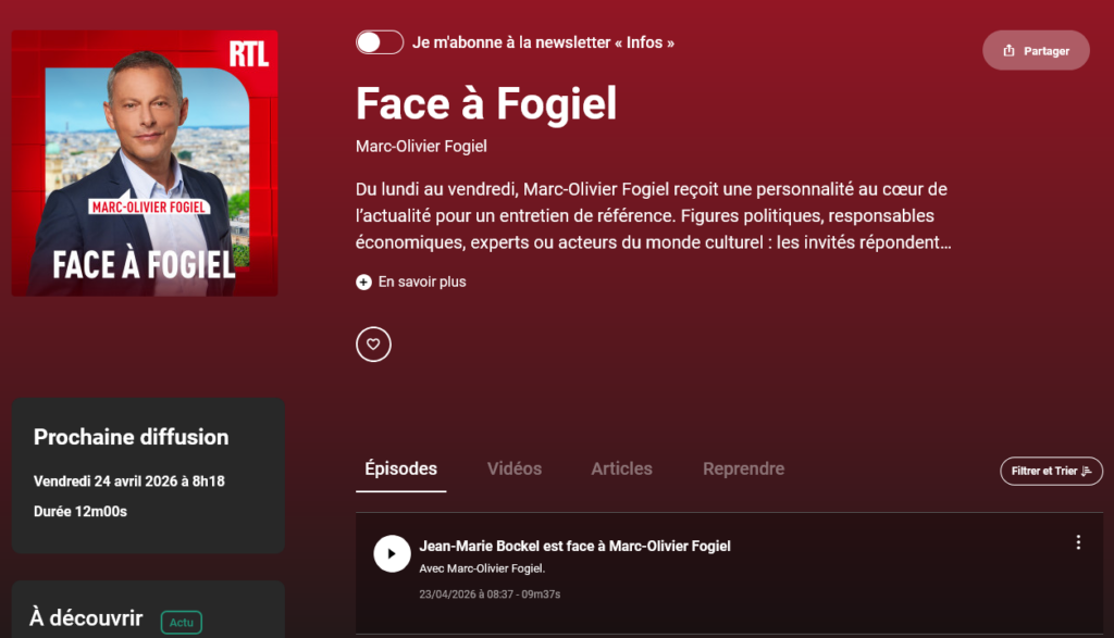 L’interview du jeudi 23 avril 2026 sur RTL, dans l’émission Face à Fogiel